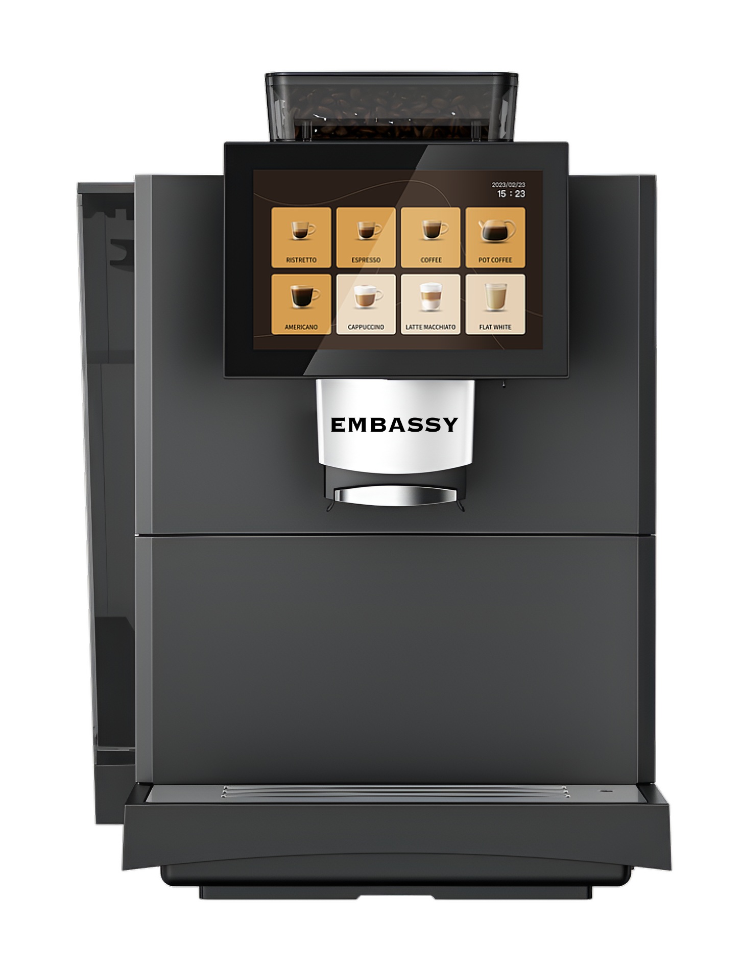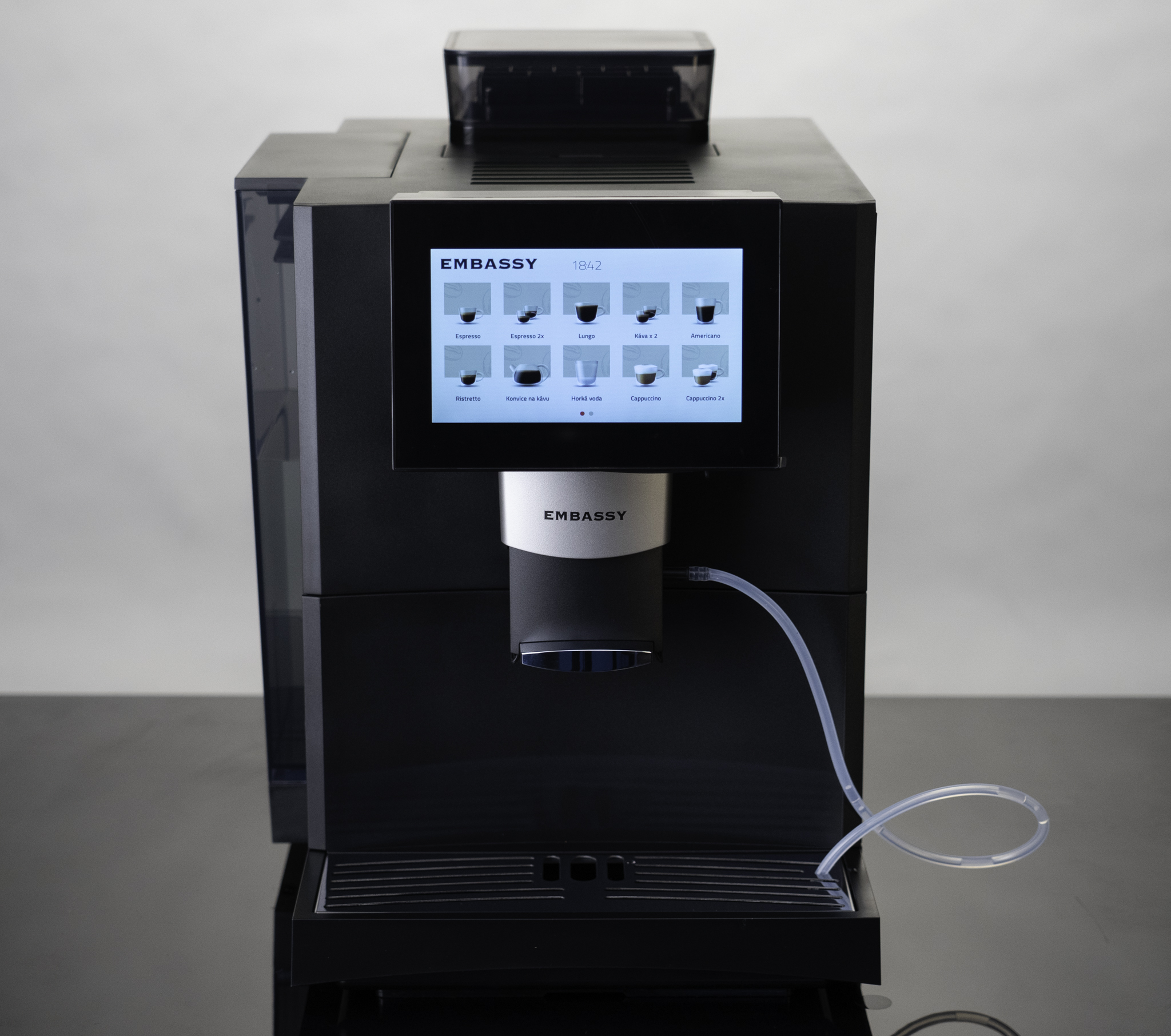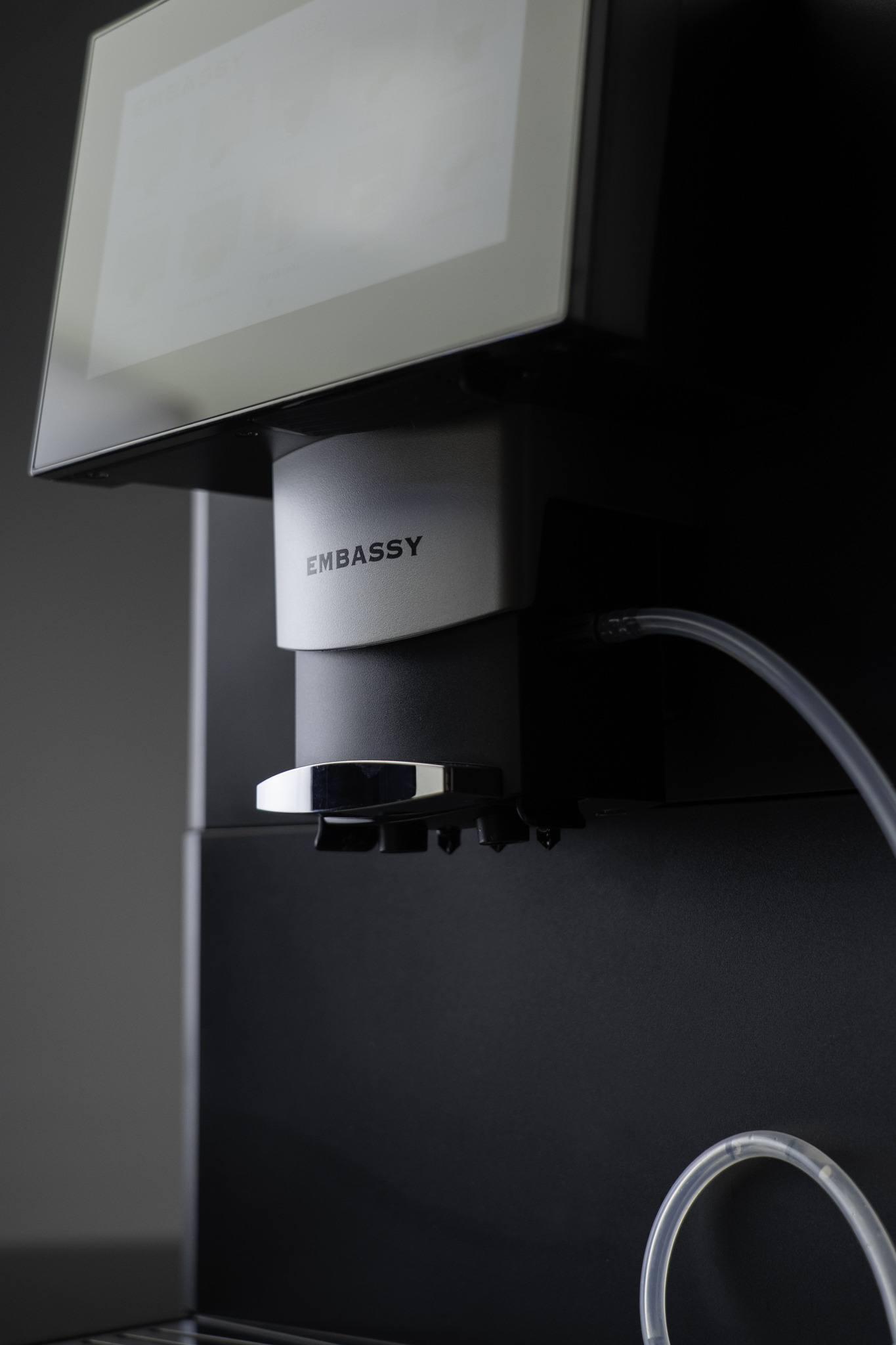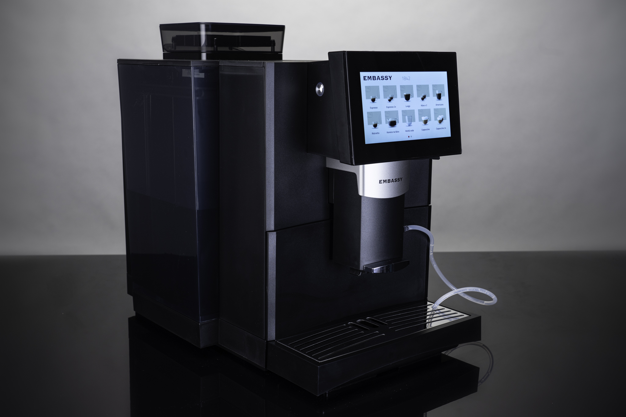 Profesionálny kávovar Embassy Lima s oceľovým kónickým mlynčekom, 7″ dotykovým displejom a odporúčaným výdajom 50 porcií denne. Ideálny pre kancelárie a menšie prevádzky.
